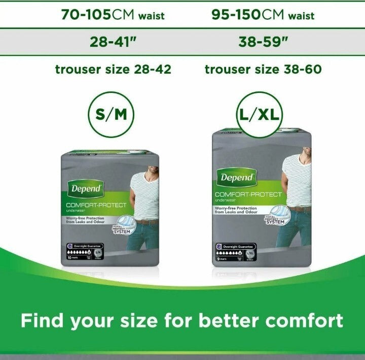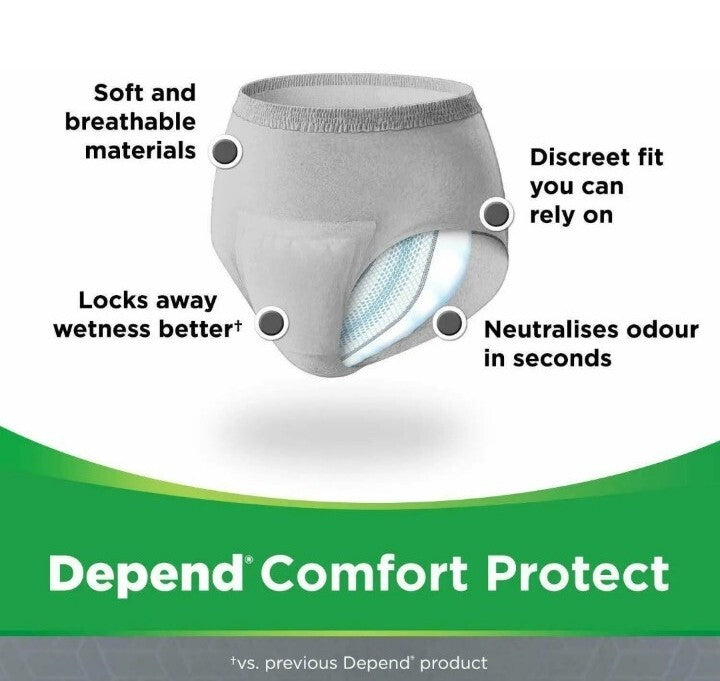 Reclaim and reconnect with what matters most in your life. Depend Comfort Protect Incontinence Pants for Men give you more freedom to forget about leaks.* Depend disposable pants feature the Total Protection system that has been specifically tailored with the combination of fast-absorption channels and odour-eliminating filters. Trust in Depend pants for worry-free protection from leaks and odours. Drawing wetness away from the skin, the comfortable, discreet pants have snug, pant-like leg openings with all-around elastics for a close-to-body fit - just step in and pull on. And with the improved waistband for added security, Depend Comfort Protect for Men provide a pant-like fit. Depend incontinence pants are soft, quiet, breathable and discreet.