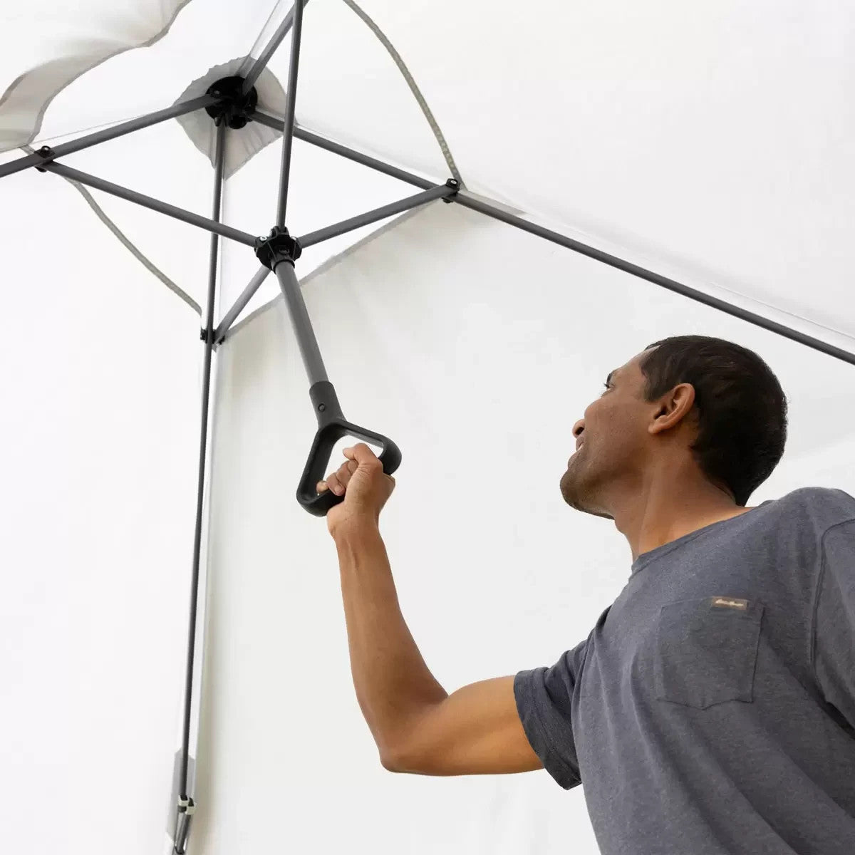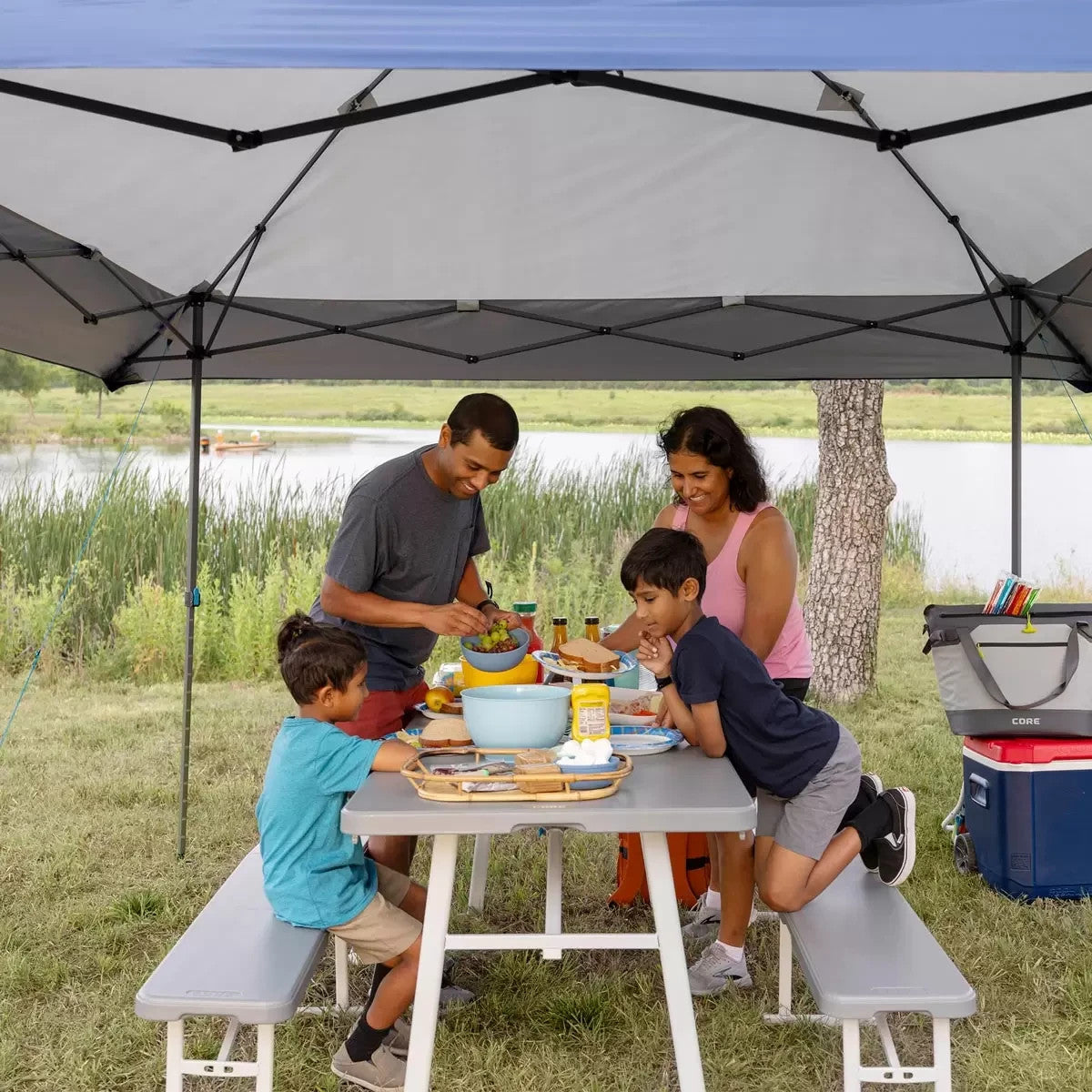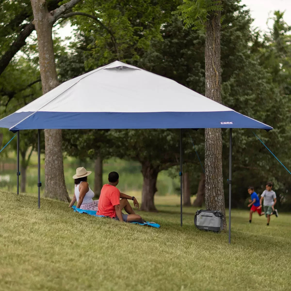 Experience even greater shade coverage with the CORE 13x13ft Centre Push Eaved Shelter. Utilizing the innovative Centre Push Technology, you can effortlessly set up camp in just 2 minutes. Enjoy the breeze with the vented roof design that enhances airflow, and a generous 169 square feet of shade with 50+ UV protection, thanks to its extended eaves. Selecting your ideal campsite has never been simpler, with the canopy's user-friendly features. With 15 auto-locking height adjustments, complemented by pinch-free lock release buttons, you can effortlessly tailor the canopy's height to your preference. Meanwhile, the self-adjusting all-terrain feet guarantee stability, even on uneven ground, making it a versatile choice for a wide range of outdoor locations. When it's time to wrap up your outdoor adventure, keep your guylines organized with the convenient storage pocket, and your stakes close with the internal pocket. Clean-up is a breeze as all items pack up in the included wheeled carry bag for easy transport and storage.