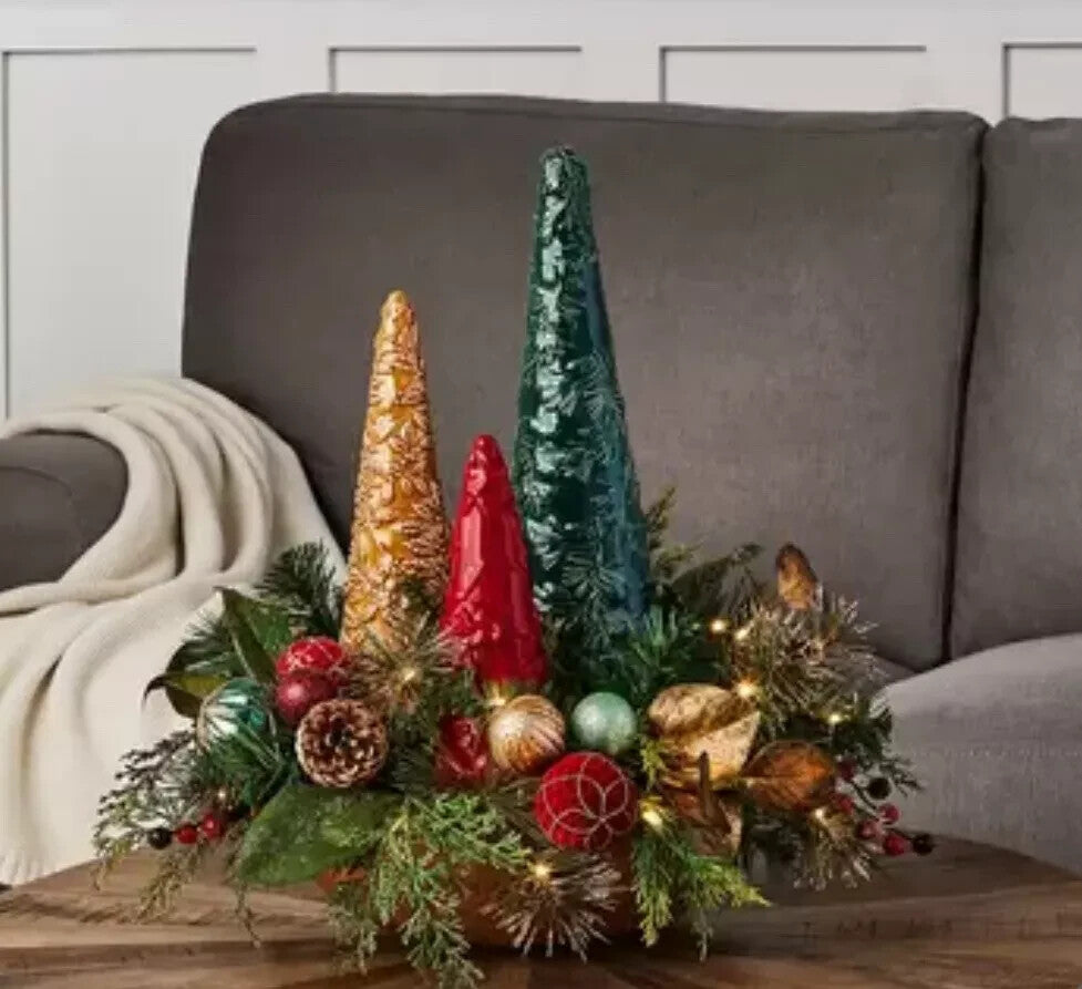 Red: This 19.5” (49 cm) pre-lit decorated centrepiece is a festive addition to any home. Embossed ceramic cone trees feature in classic holiday tones. The wood-look bowl is filled with faux cedar, pine, and gold-tipped bristle pine. Natural pinecones, faux red berries, eucalyptus, magnolia leaves and faceted ornaments complete the look. Pre-lit by 35 micro-LED lights and operating on a timer, this arrangement brings a holiday glow to any location in your home.