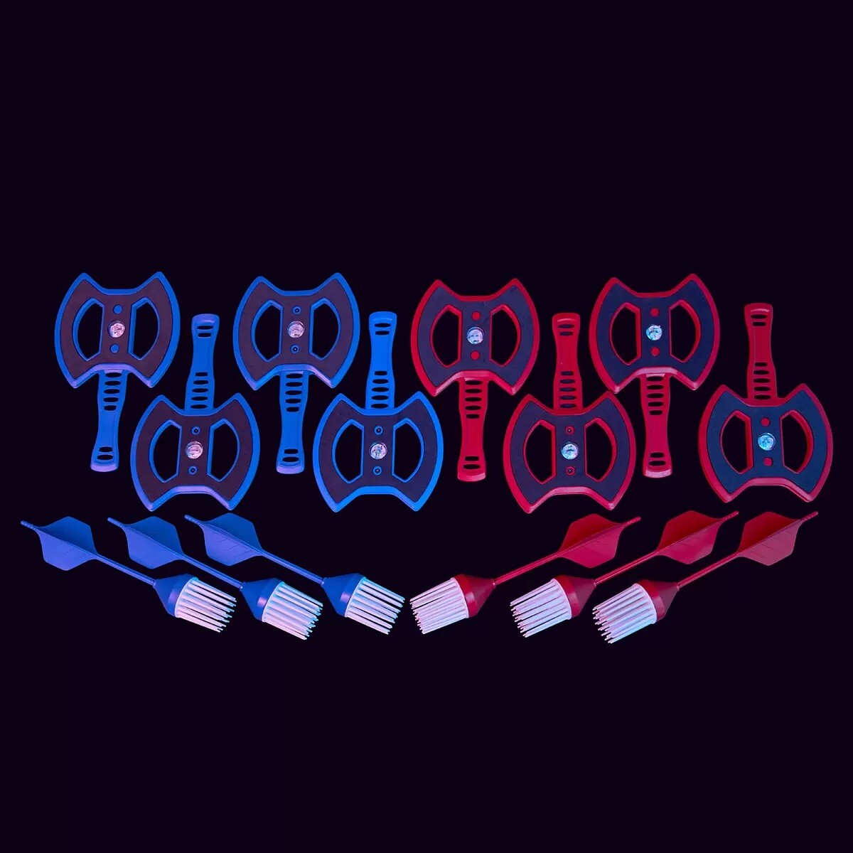 - Includes 8 Light Up Axes and 6 Bristle Darts