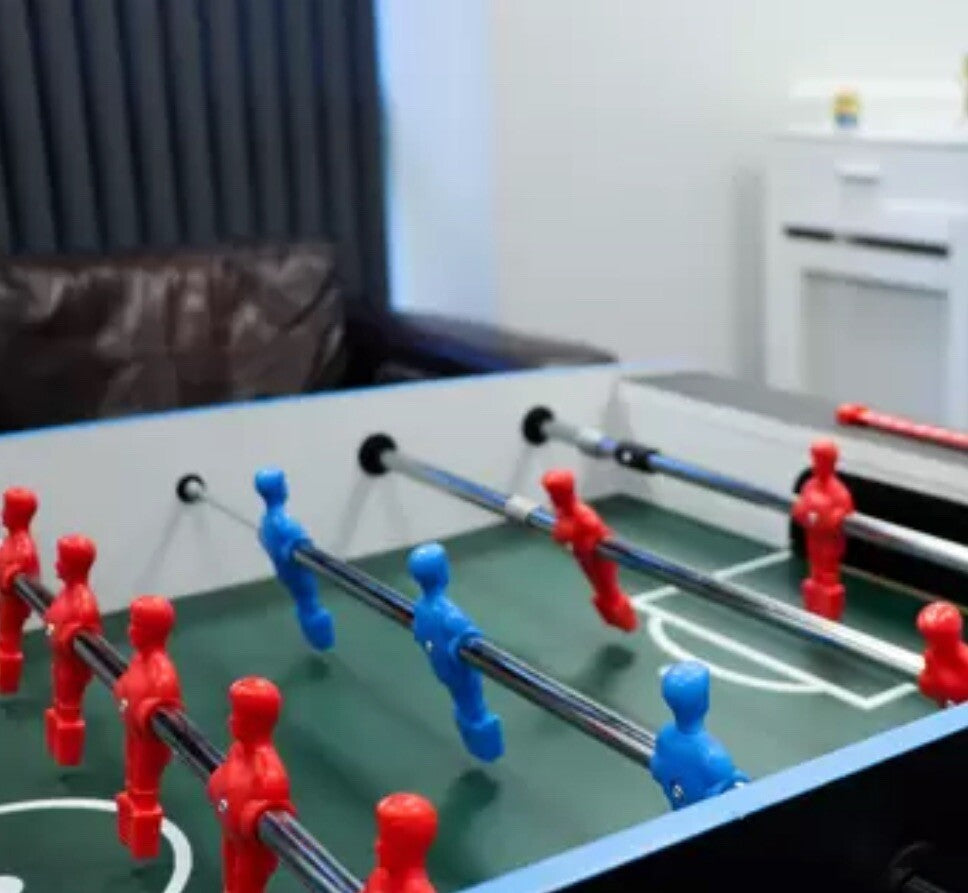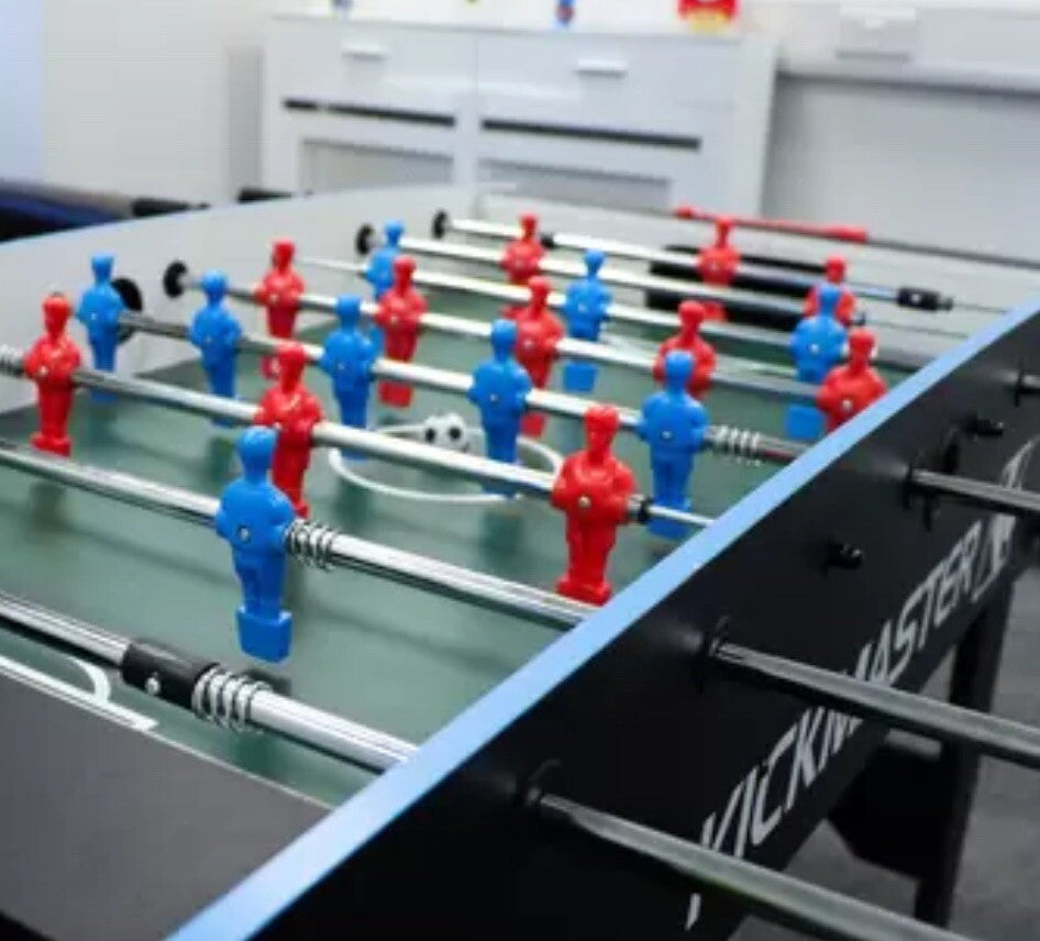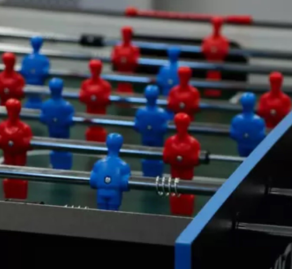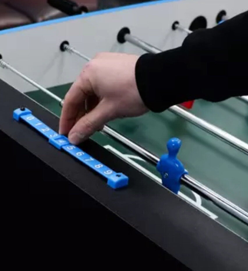 The quick folding system allows for easy storage when not in use, while the sturdy legs with extra support braces and level adjusters ensure stability during intense matches. The fast-play concave pitch design enhances gameplay speed, and the spring-loaded telescopic rods provide safe, smooth control. Each goal features a ball return port, and team colour-coded scoring abacuses make tracking points effortless.