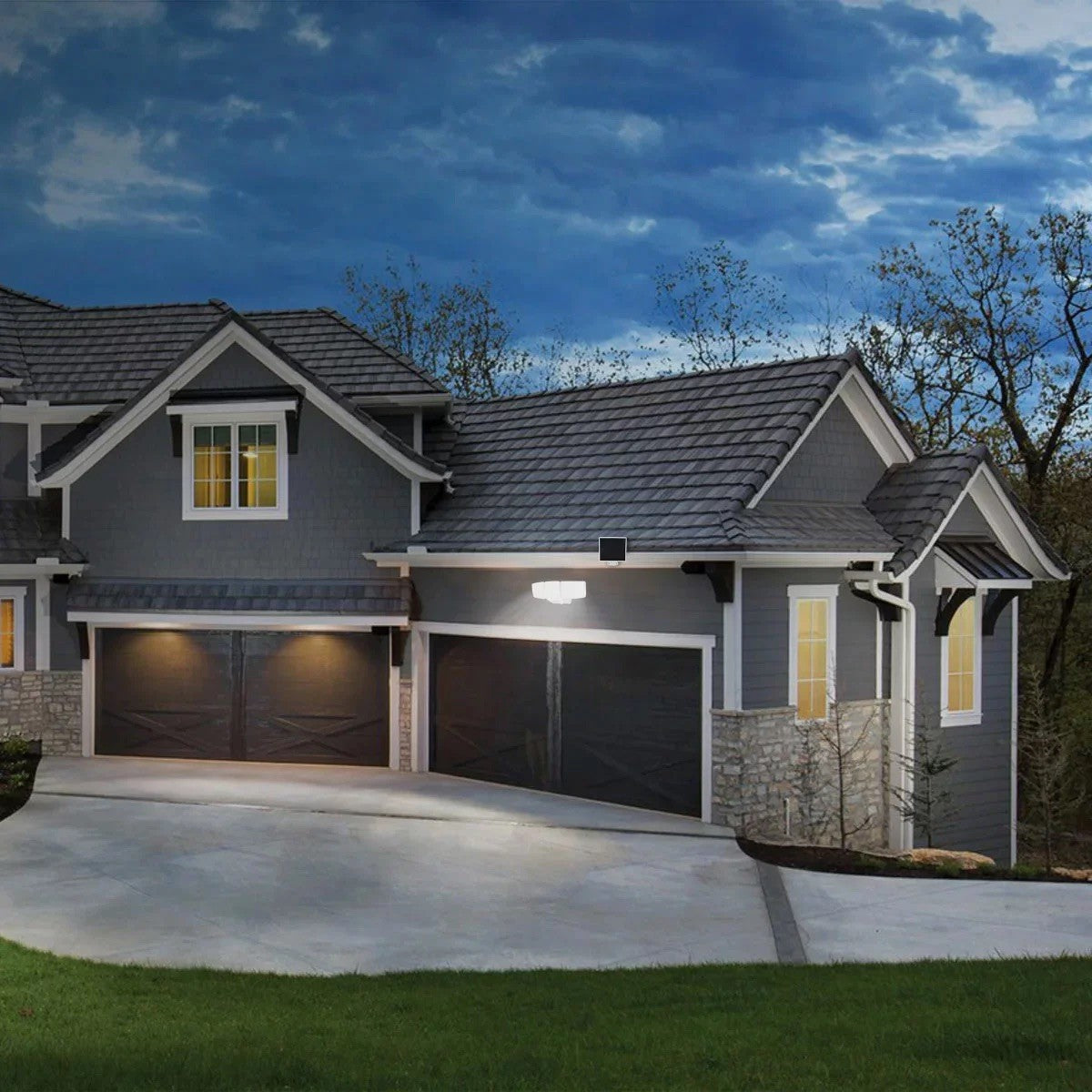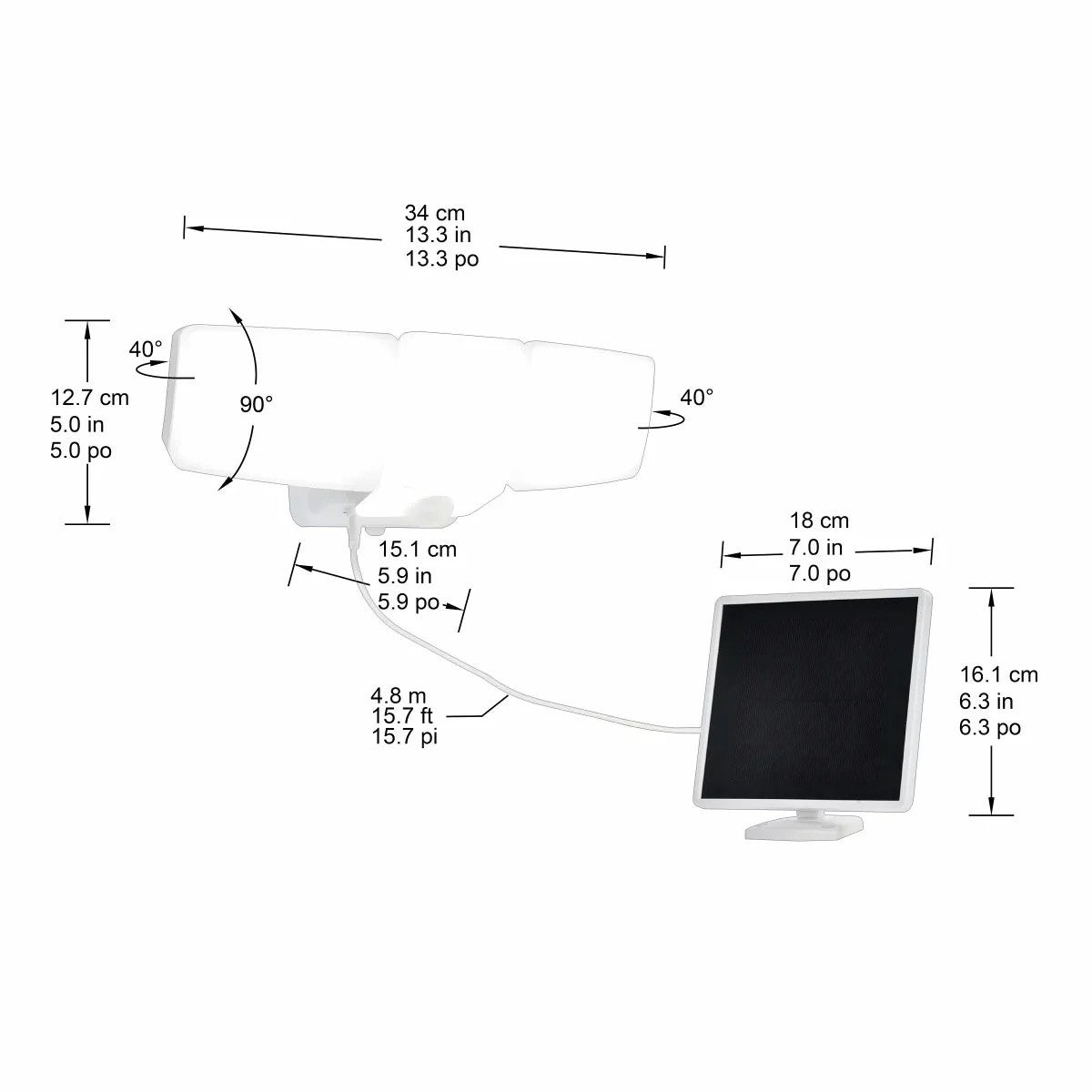 The adjustable triple-head LED lamps ensure flexible angle adjustments, to maximize the illuminated outdoor spaces. The brightness is adjustable from 1250 to 2500 Lumens. Monocrystalline solar panel includes 4.8m( 15.7ft) of wire allowing adjustable positioning for optimal sunlight collection. The Integrated Motion Sensor reaches up to 18m (59 ft) and a 180° wide detection zone. The detached solar panel includes a cord to ensure you can position it for optimal sunlight exposure. This light is fully weather resistant IP44 and maintenance free, suitable for outside use in yards, garages, sheds, patios, decks, pool areas and other remote locations. Make sure there are no other light sources aimed at the solar panel. Solar panel must be at least 1 foot / 0.3 m or more above the light fixture.
