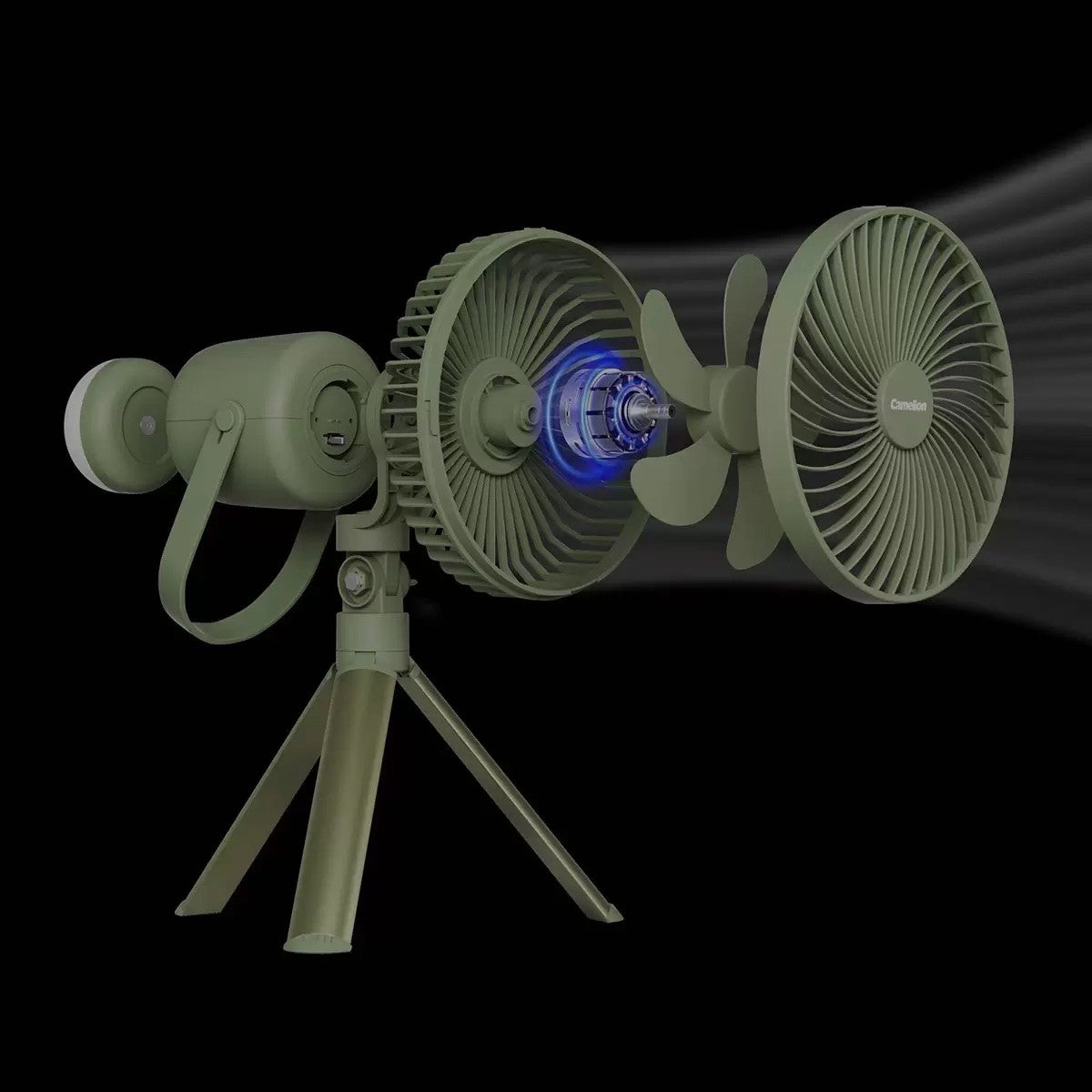 New Camelion Rechargeable Camping Fan with LED Light, Tripod, USB, Quiet 3-Speed
