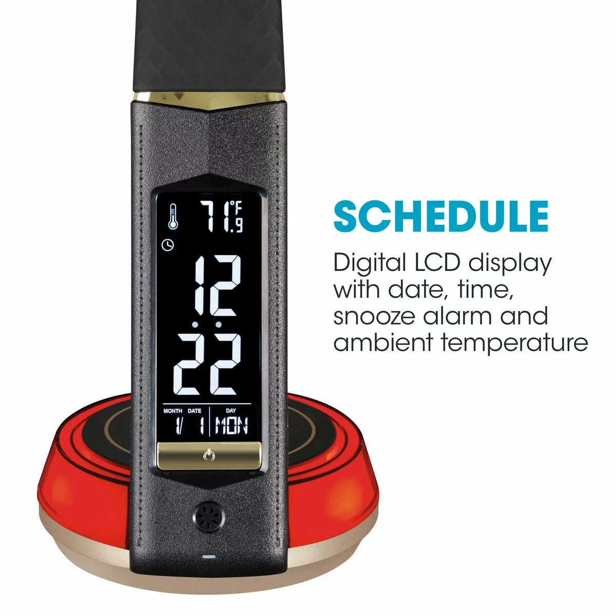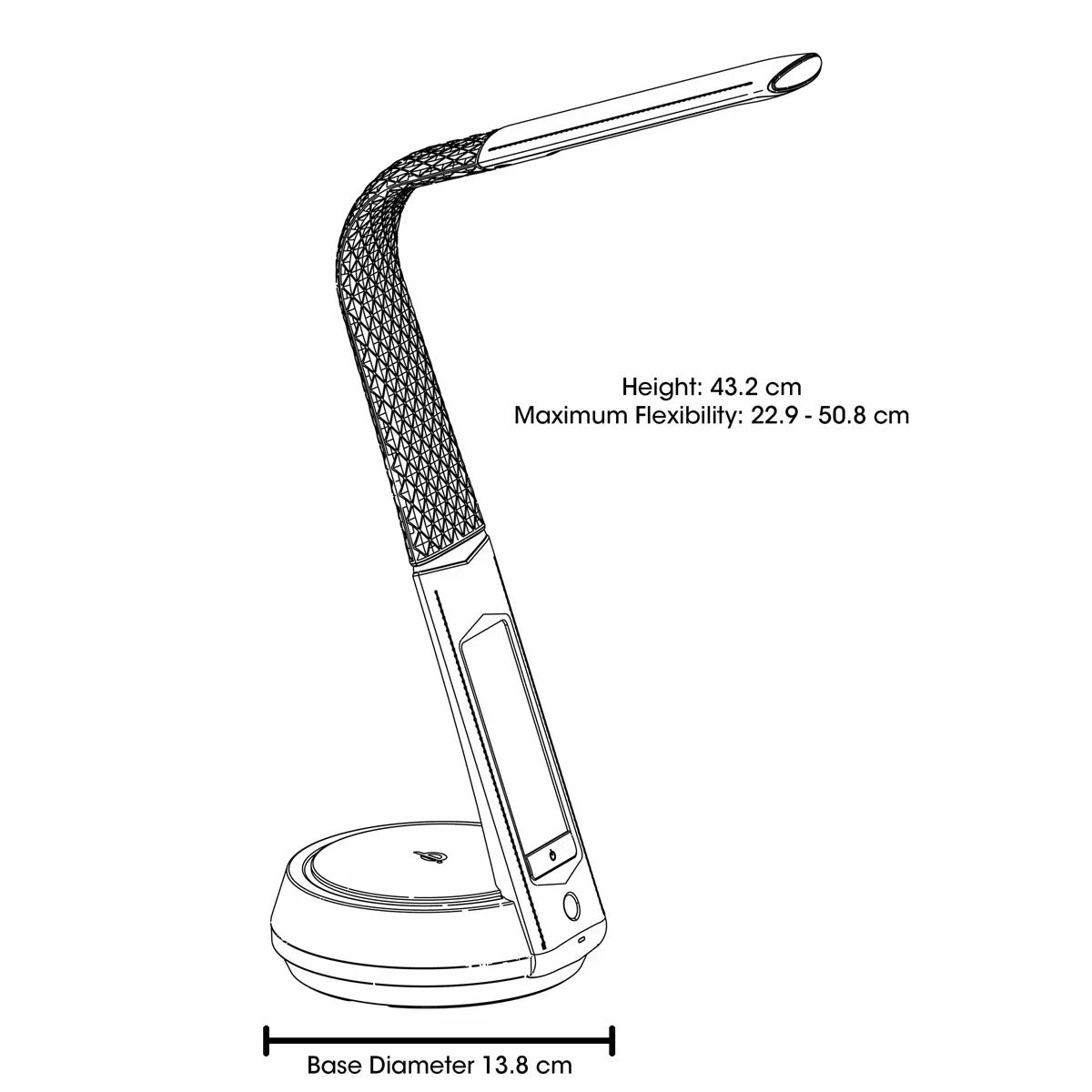 Charge two devices at once with the 5V, 2.1A USB port for charging tablets, earphones, speakers, and phones, and the Qi-wireless charging pad on the lamp’s base for Qi-enabled devices. At a glance, use the digital display to see the time, temperature, date and day of the week. The digital display also features an alarm with snooze capabilities. To completely customise your lighting experience, use the touch activated controls to choose from three LED colour modes (warm white, bright white and ClearSun® natural daylight) in your choice of three brightness levels. The base glows in the colour of your choice or cycles continuously through the entire spectrum. Stylish and functional, this lamp features metal accents and a flexible rubberised neck with textured diamond pattern.