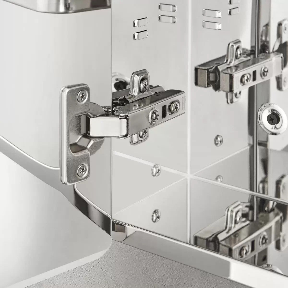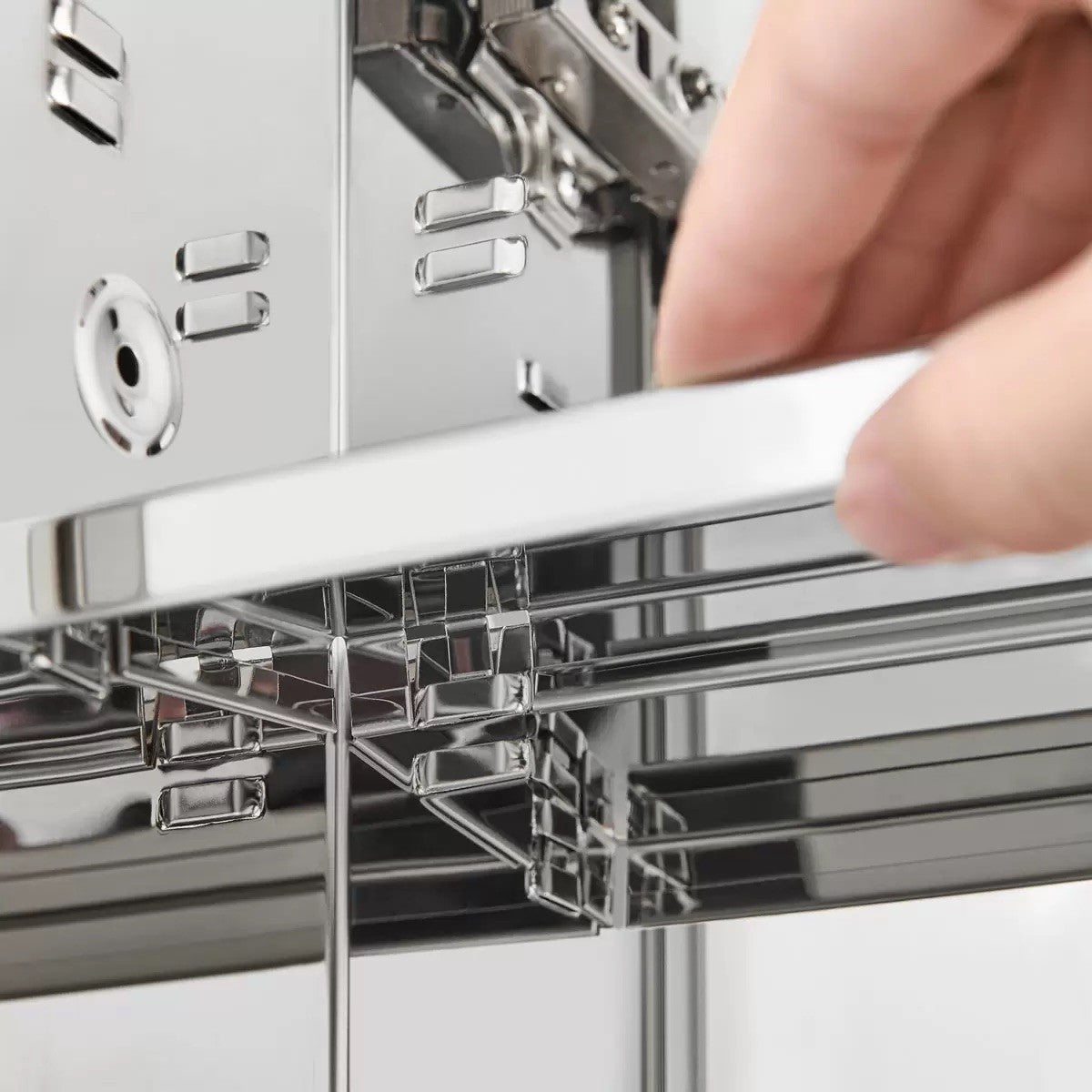- Polished stainless steel panels with a mirrored finish inside and out