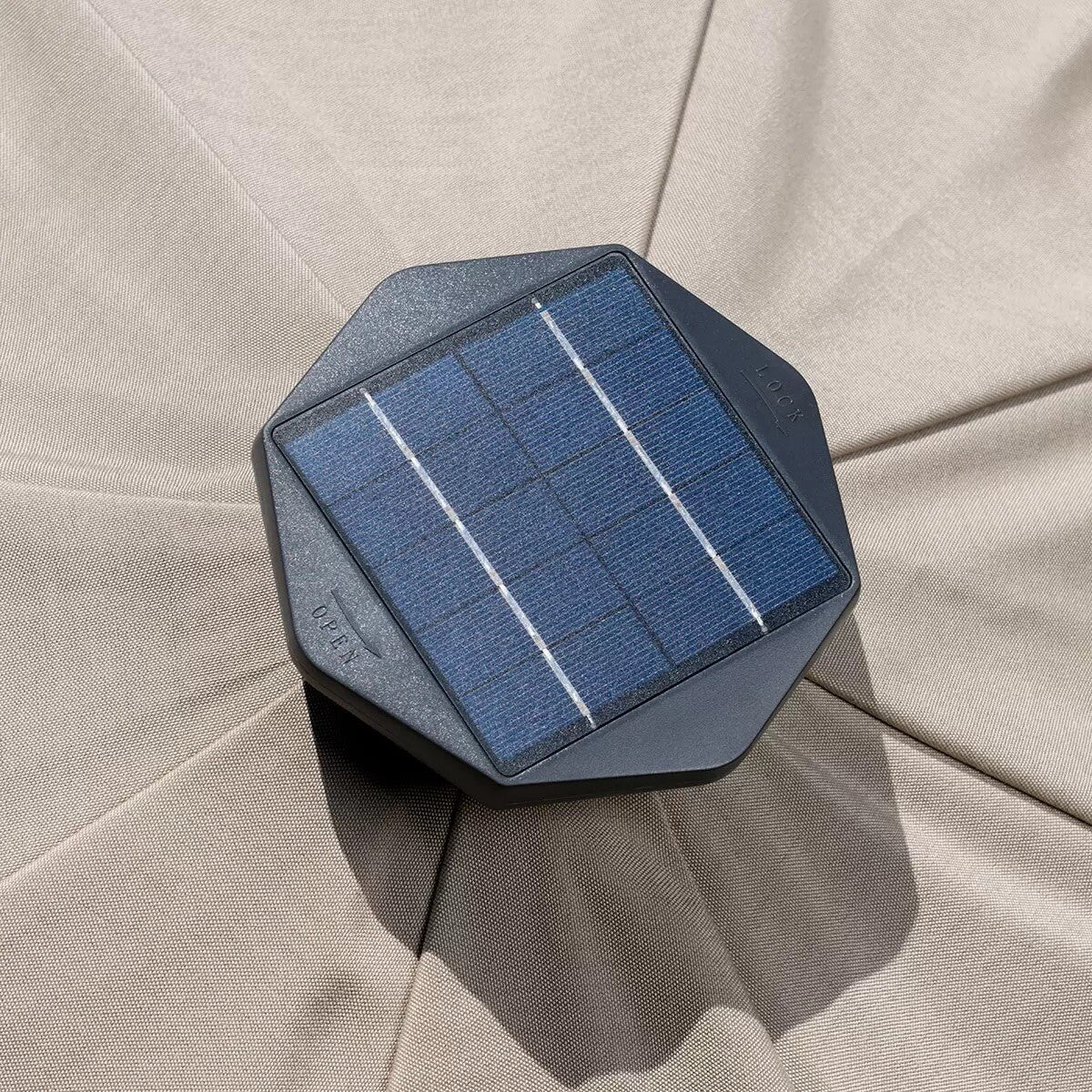 Integrated full beam dimmable bar lights along its ribs, offers not only ambient illumination but also a warm, inviting glow that enhances the atmosphere of your evening gatherings. The lighting is powered by a removable lithium-ion battery pack, which can be charged using either the solar panel for eco-friendly energy or the included AC adapter for convenience, ensuring that the lights remain bright and functional.