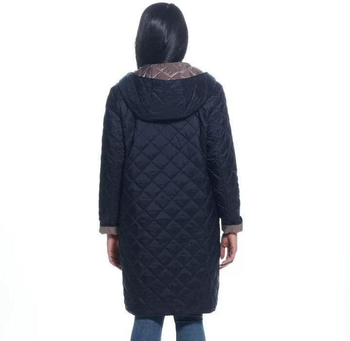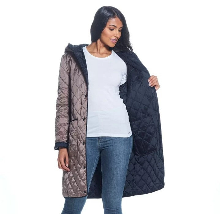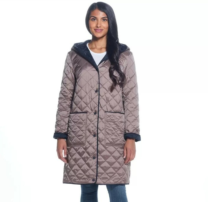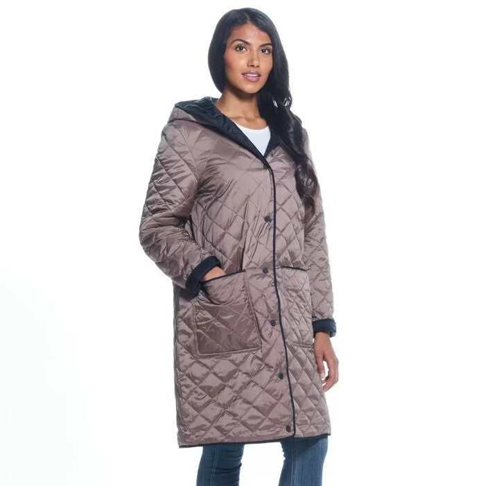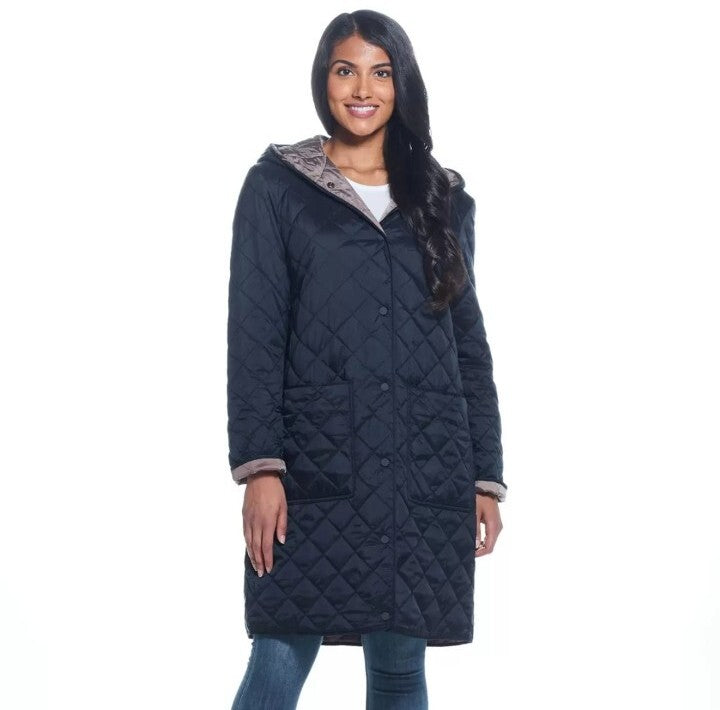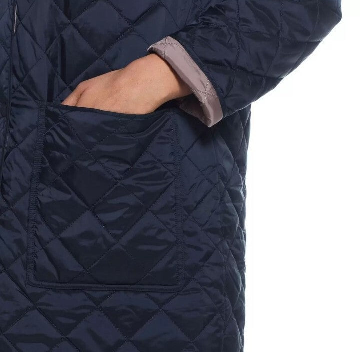 Weatherproof Ladies Reversible Quilted Long Jacket in Navy / Taupe in Size S